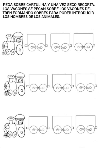 😃 Las siguientes págs. primeramente se pegan en cartulina y se deja secar. Luego se recortan los vagones y se pegan sobre los vagones de los trenes anteriores de tal manera que se formen con ellos SOBRES para poder clasificar correctamente los animalitos: